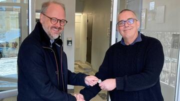 Pierre Choquette, Directeur général adjoint - Développement, stratégies et communications pour l'OMHM, reçoit les clés de Serge Dufresne, directeur senior pour Capreit (anciens propriétaires).