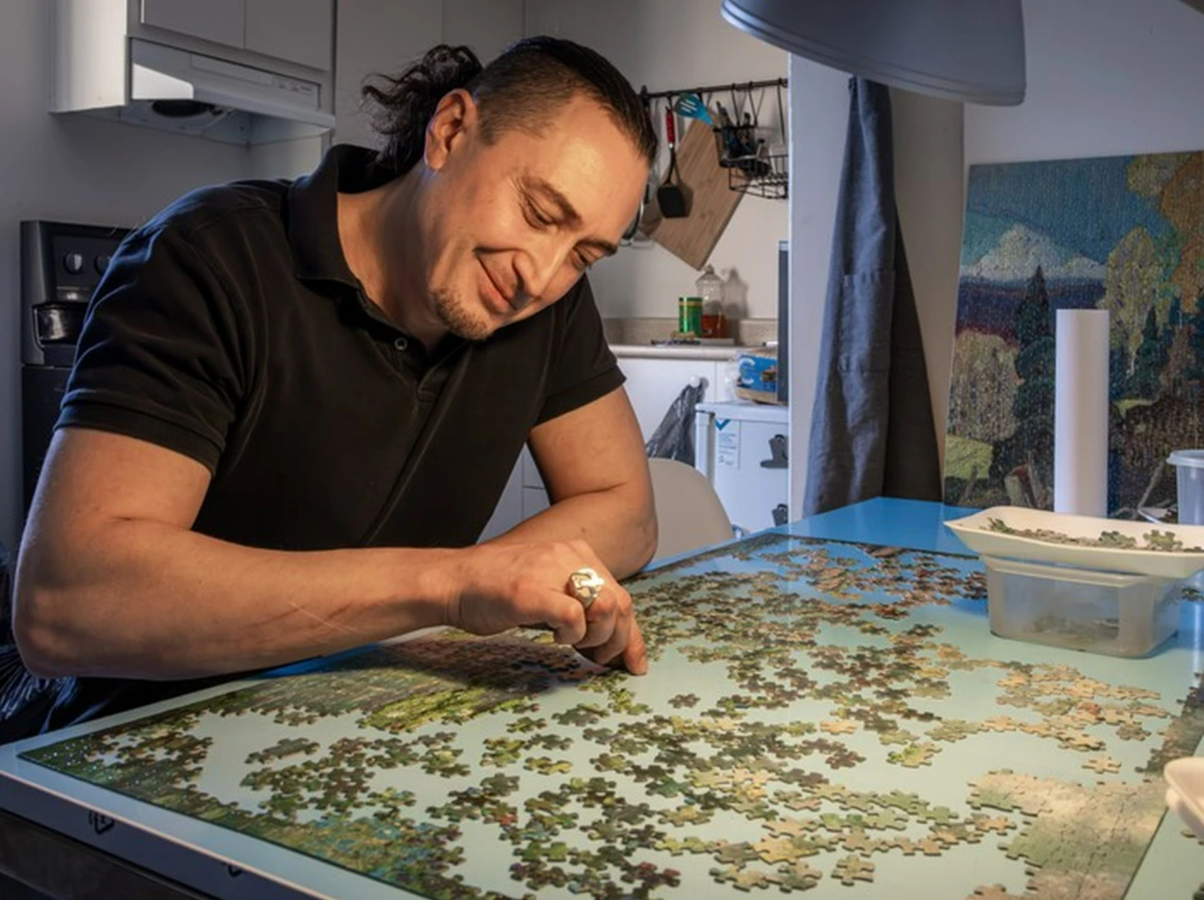 Rashid Gizitdinov travaille à un casse-tête dans son nouveau logement. Photo : Dave Sidaway /Montreal Gazette